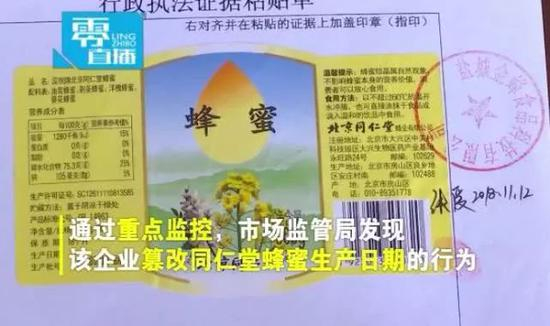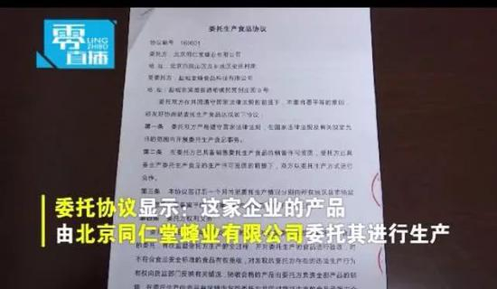 执法人员告诉记者,这家企业的产品是北京同仁堂蜂业有限公司委托生产的,该企业提供的协议显示,委托生产协议的起始日期为2016年9月,公开资料显示,北京同仁堂蜂业有限公司是由北京同仁堂股份有限公司控股的子公司。