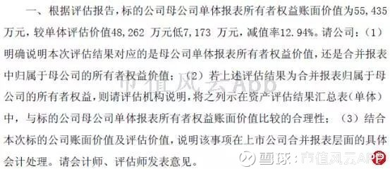 此外,上交所在12月14日的问询函中,要求公司明确说明评估价值48,262 万元对应的是母公司单体报表所有者权益价值,还是合并报表中归属于母公司的所有者权益价值。
