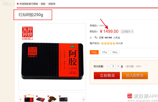 每年一度的东阿阿胶产品涨价,仿佛已经成为惯例。爱股票在东阿阿胶官方旗舰店看到,此次涨价后,250克标准装阿胶块的售价1499元,目前价格将近3000元/斤。其实,在2001年,东阿阿胶的阿胶块零售价为每公斤仅为80元,也就是说,在过去的18年时间,东阿阿胶的价格涨幅将近67倍。