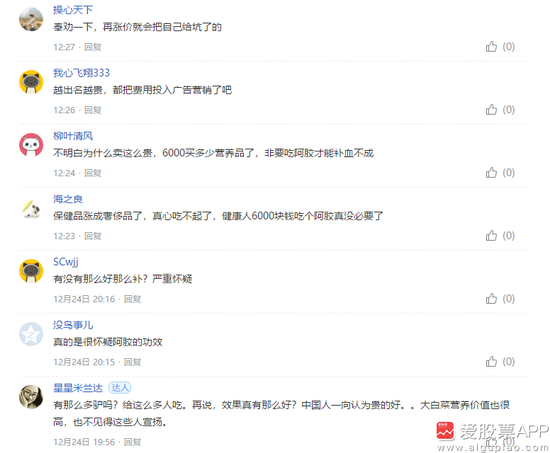 所以,消费者似乎对“驴皮涨价”的理由并不买账,得知东阿阿胶再次涨价一事,许多爱股票用户表示,东阿阿胶对品牌文化营销投入的不断加大,品牌溢价自然会导致价格上涨。阿胶的性价比在降低,价格已渐渐超出承受范围,相比之下会选择其他保养品来代替阿胶。