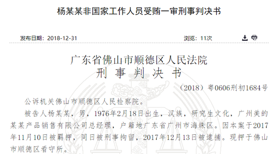 新浪财经讯 1月4日消息,近日,裁判文书网显示,美的集团合作商广州盛美卓越电器销售有限公司总经理杨军利用职务便利,侵犯公司财产50万元。被美的集团审计人员发现后,杨军主动投案获刑1年。
