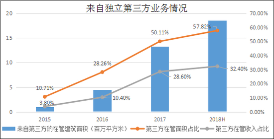 虽然能够得到母公司旭辉控股的支持,但永升服务依然保持主动向外的态度。自2015年以来,永升服务来自第三方的在管面积持续增加,且占比也持续提升,到18年6月底来自第三方开发商的在管建面占比已达57.8%。来自第三方开发商的项目所贡献的收入占比从2015年3.8%上升至2018年上半年的32.4%。