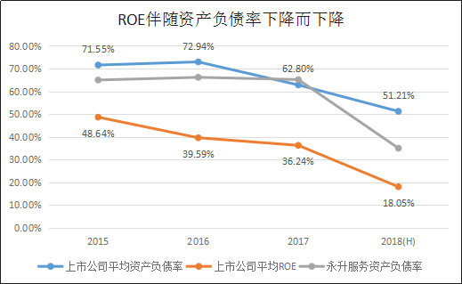 物业管理公司多是轻资产、高杠杆的,永升生活公司近几年的的资产负债率如下图所示,与高负债率相对应的是较高的ROE水平,2017年公司的净资产收益率达37.07%。随着物业管理公司上市融资,行业整体的资产负债率逐步下降,ROE也随之下降。
