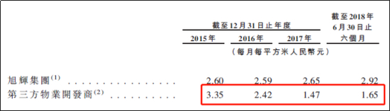 自2015年以来,永升服务的平均物业管理费从2.68元/月/平方米下降至2018年的2.26元/月/平方米,这主要是由于占比逐渐提升的第三方物业的平均管理费用逐年下降造成的,其单位费用由2015年的3.35元/月/平方米下降至2018年上半年的1.65元/月/平方米,而旭辉控股集团的物业单位管理费用却有所增加,如下所示。
