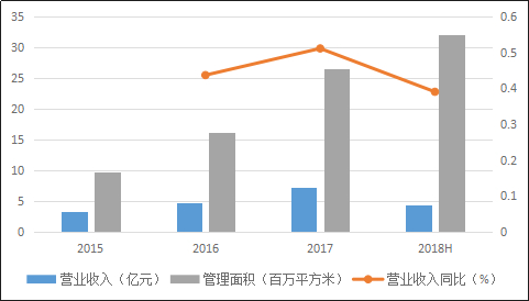 招股说明书显示,自2015 年来,公司发展较快,营业收入从2015年的3.34亿元增长到2017年的7.26亿元,2018年上半年更是达到了4.39亿元,同比增长39%。截至2018上半年,公司在全国35个城市总计管理建筑面积达32.1百万平方米,项目数为208个,其中以住宅项目为主,占2018年上半年所管理建筑面积的81%。收入占比方面,住宅收入占比从2015年的70.4%升高至2018年的73%。