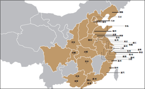 公司的物业主要集中一、二线城市,在东部地区(上海、苏州、徐州、南京、杭州、宁波、厦门等城市)收益占比高达67%,在北部地区(北京、天津、廊坊)收益占比为17%,两地区合计占比达84%,如下图所示。