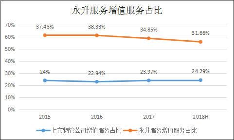 永升服务的业务主要分为两部分,物业管理服务及增值服务,而增值服务又包括业主增值服务、非业主增值服务两部分。2018年上半年,基础物业管理服务与增值服务占比分别为44.2%、56.8%,两项业务的毛利率为68.34%、31.66%。