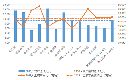 公司2018年上半年整体毛利率为28.81%,净利润率为9.17%,净利润率指标处在上市物业管理公司(含拟上市)第十位。公司盈利能低一方面是由于平均物业管理费下降的缘故,另一方面则是由于人均成本占比较高的缘故,永升服务人工成本占比从2015年的57.8%上升到2018年上半年的60%,这不仅高于已上市公司的平均值,也高于中国指数研究院统计的全国百强物业管理公司的平均值。相应的公司人均产值也相对较低,如下图所示。