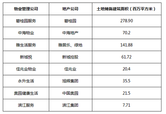 2018年上半年财报显示,碧桂园服务的合约储备管理建筑面积为249百万平方米,位列13家物管公司的之首。作为物业公司所依赖的地产公司,碧桂园的目前土地储备相当充足,克而瑞数据显示,2018年上半年碧桂园土地储备建筑面积为278.9百万平方米,碧桂园的储备面积与碧桂园服务的储备面积之和约为528百万平方米,是2017年碧桂园服务管理面积的近4倍。而中海物业、新城悦、永升生活、雅生活等背靠的地产公司所拥有的土地储备面积明显较少。