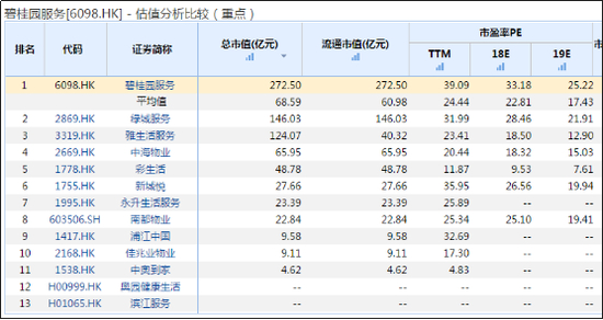 从已上市(港股、A股)公司的总市值比较来看,碧桂园目前总市值及流通市值均为272.5亿元,而行业均值为68.59亿元,碧桂园服务远超行业平均水平,排在碧桂园服务之后的是绿城服务,总市值约为碧桂园服务的一半。
