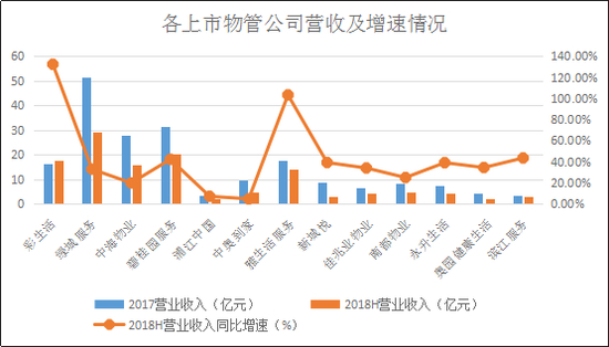 公开资料显示,自2015 年来,碧桂园服务发展较快,营业收入从2015年的16.73亿元增长到2017年的31.23亿元,2018年上半年更是达到了20.23亿元,同比增长42.23%。截至2018年上半年,公司在全国260个城市总计管理建筑面积达136.8百万平方米,项目数为536个,其中以住宅项目为主,占2017年上半年所管理建筑面积的98.7%。收入占比方面,住宅收入占比从2015年的99.9%下降至2017年的95.4%。