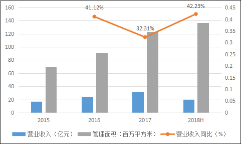 公司所管理得物业面积主要集中在华南、华东地区,该地区所贡献的收入占比也一直处在高水平,2018年上半年占比为71%,如下图所示。