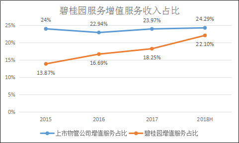 碧桂园服务盈利水平的改善,一方面是公司增值服务占比有所提提升。2015年、2016年、2017年公司的增值服务收入占比呈现逐年提高的趋势,如下图所示。但目前公司增值服务占比略低其他上市物业管理公司,2018年上半年增值服务收入占比仅为22.1%,同期行业平均水平为24.29%。
