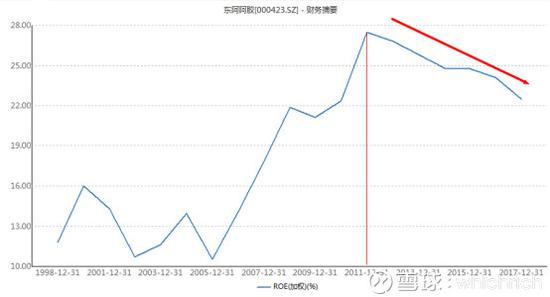 所以对于东阿阿胶来说,如果其ROE从27%下降至22%,背后的意思是说公司的盈利能力在下行,这笔生意还是很赚钱,但没有以前那么容易和好赚了,那么理论上,公司其他因素不变的情况下,ROE的下行必将带来估值的下行(至于为什么ROE会变化,就得结合之前基本面研究文字里提到的那些因素去思考)。