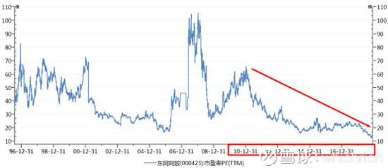 从公司的历史数据我们可以看到,东阿阿胶自从2011年开始ROE便开始持续下行,从27.47%下降至22.46%。与此同时,公司的估值也相应地下行,从64倍PE估值跌至12倍。