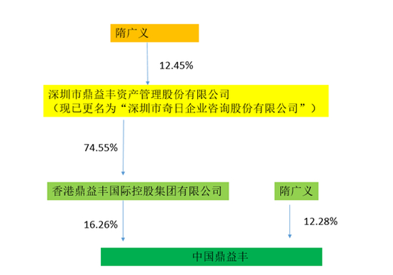 公开资料显示,香港鼎益丰国际控股集团有限公司为中国鼎益丰第一大股东,持股比例为16.26%,隋广义为第二大股东,持股比例为12.28%,二者合计持有中国鼎益丰28.54%股权。而深圳鼎益丰持有香港鼎益丰国际控股集团74.55%股权,所以隋广义为中国鼎益丰实际控制人。