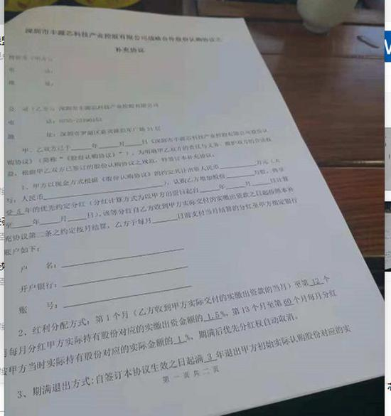 记者提出想购买高收益产品。鼎益丰市场部的一名销售人员拿出了一份股权战略合作协议合同,称:“这是丰源芯公司的股权投资合同,公司目前评估价值500亿元,由国家工信部评估,总股本12亿股,现在6元/股,投资期限5年,第一年年化收益率18%,往后每一年年化收益率是12%,到第五年退出之后还有每年按照15%的溢价分红,起投门槛是50万元,丰源芯马上就要上市了,你也可以不退出继续持有,等丰源芯上市了你可以置换成原始股,成为公司股东。”