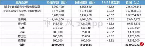 按照1月11日的收盘价(46.32元/股),和谐成长可套现3.97亿;华睿投资可套现2.26亿、宗佩民可套现6504.72万。