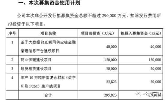 定增预案一开始也极为大气,称拟募资29亿元建设基于大数据的互联网供应链金融管理信息平台、商业保理、融资租赁、年产10万吨新型复合材料(数字印刷PCM)生产线等项目。但多次修改后,最终定增方案及实施完成仅为募资3.76亿元,用于年产10万吨新型复合材料(数字印刷PCM)生产线等项目,在2018年4月份中科新材也终止了对该项目的募投。