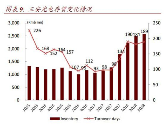 细心的投资者可以发现,从2017年4季度开始,三安光电的存货周转天数大幅提升,这其实已经预示着产业繁荣周期进入到尾声。
