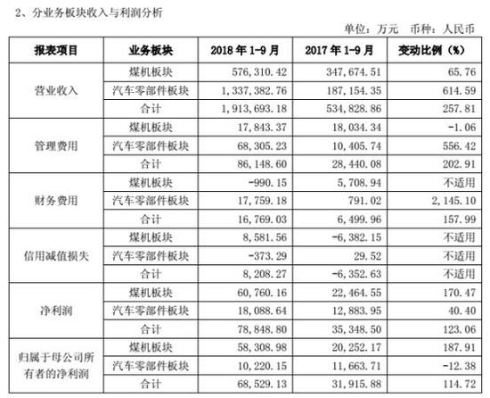 从郑煤机最新业务构成上看,2018三季报显示:公司煤机板块收入57.63亿元,同比增幅为65.76%;占总营收的30.11%;汽车零部件板块收入133.74亿元,同比增幅 614.59%,占比69.89%。