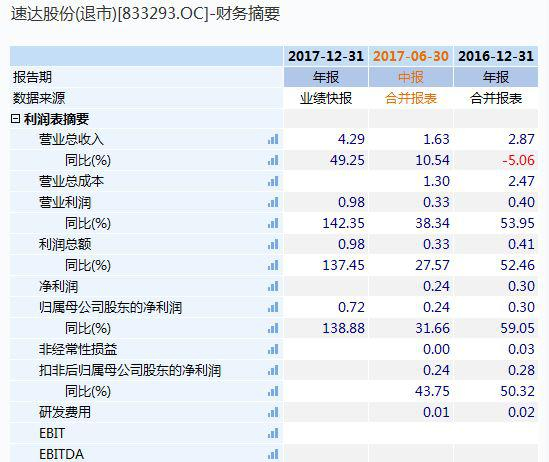根据速达股份2017年业绩快报显示,2017年营收4.29亿元,同比增长49.25%,净利润为7220万元,同比增长138.88%。