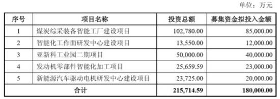 募资主要用于:煤炭综采装备智能工厂建设项目 、智能化工作面研发中心建设项目 、亚新科工业园二期项目 、发动机零部件智能化加工项目 、新能源汽车驱动电机研发中心项目等项目。
