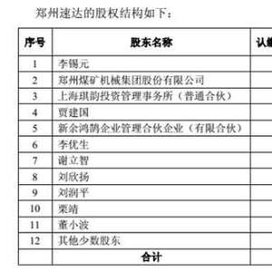 工商信息显示,郑州速达工业机械服务股份有限公司成立于2009年7月7日,注册资本5515万元,根据郑煤机2018年12月18日公告显示,第一大股东为李锡元持有31.1%股份,郑煤机持股30.83%为其第二大股东。投实APP,情报级金融信息终端
