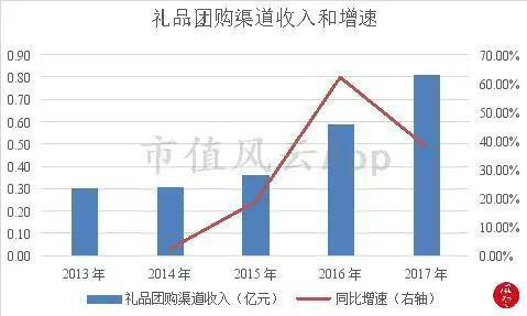 公司礼品团购渠道收入由2013年的0.30亿元增长至2017年的0.81亿元,年均复合增长率28.19%,增长较快,同比增速总体上向上,2017年的同比增速为37.79%,相较于2016年的同比增速有所下降。