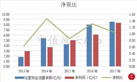 分开来看,公司2013年至2017年的净现比分别为0.62、1.46、0.85、1.31和1.03,总体上来说,公司创造的净利润都收回了现金,净利润现金含量较高。