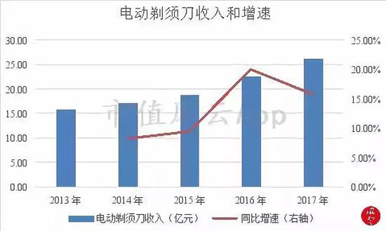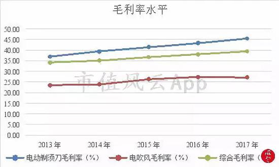 公司2013年至2017年电动剃须刀实现的收入分别为15.91亿元、17.22亿元、18.85亿元、22.60亿元和26.15亿元,年均复合增长率为13.23%,增长较快。