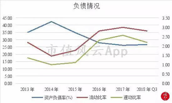 公司的资产负债率2013年至2018年前3季度分别为34.90%、42.27%、34.66%、27.79%、25.97%和26.54%,整体上呈现下降趋势,资产负债率水平较低,偿债风险较小。