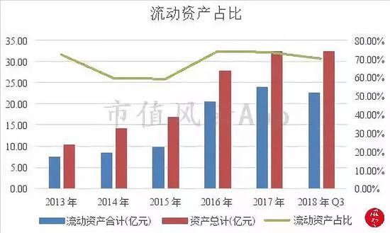 公司的流动资产由2013年末的7.56亿元增长至2018年3季度末的22.74亿元,与总资产规模的增速相近。
