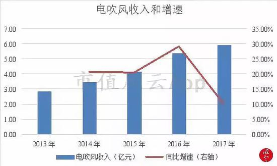 公司2013年至2017年电吹风实现的收入分别为2.87亿元、3.46亿元、4.17亿元、5.38亿元和5.91亿元,年均复合增长率为19.79%,电吹风的增长速度快于电动剃须刀,说明公司电吹风产品受到消费者的喜爱。
