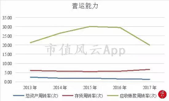 公司的总资产周转率2013年至2017年分别为2.37次、1.94次、1.79次、1.50次和1.28次,呈现逐年下降趋势,说明公司资产运营效率在走低。