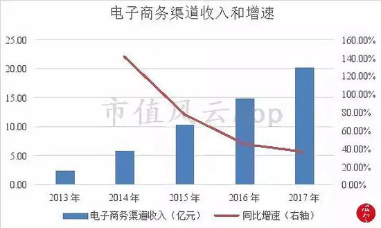 公司电子商务渠道收入由2013年的2.43亿元增长至2017年的20.15亿元,年均复合增长率69.69%,增长迅猛,但同比增速逐年下降,2017年的同比增速为35.53%,仍处于相对较高水平。