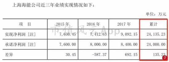 首先来看上海新能这家公司,2015年至2017年累计实现扣非归母净利润金额为24,630.45万元,承诺数为24,000.00万元,完成率为100.56%,刚好过线,算是有惊无险。
