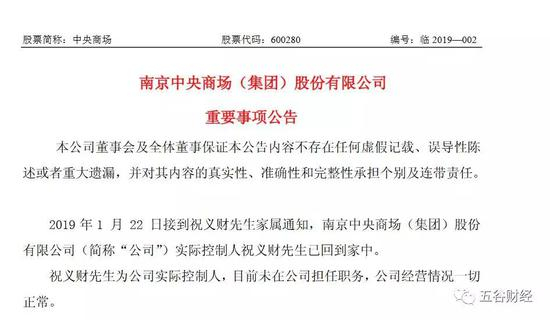果不其然,1月22日晚间,雨润食品(01068.HK)、中央商场(600280.SH)同时发布公告,确认祝义财已经回到家中,并强调公司经营一切正常。