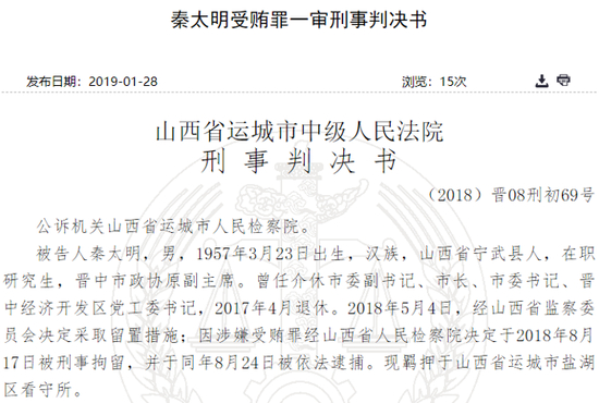 新浪财经讯 1月29日消息,昨日裁判文书网公布了山西晋中市政协原副主席秦太明的刑事判决书,根据公开报道显示,2017年4月秦太明退休,2018年5月被省纪委调查,2018年8月被通告处分。根据判决书公布的信息显示,秦太明在介休市任职的13年期间,在煤炭资源整合、企业项目建设、干部选拔任用等方面为他人谋取利益,共计折合人民币1850万元,山西安泰、义堂城峰煤业等30家企业高管向其大额行贿以换取项目便利。秦太明一审被判处有期徒刑11年,并处罚金100万,没收的违法所得依法上缴国库。