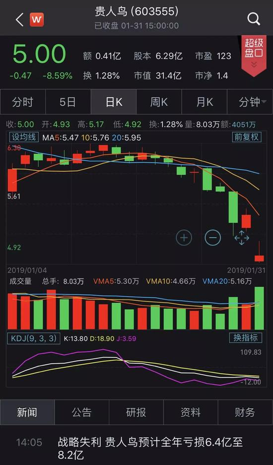 或是因业绩预亏影响,1月31日,贵人鸟股价开盘跌停,随后向上拉升,收报5.00元,下跌8.59%。