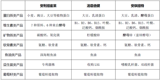 按主要成分分类看,膳食营养补充剂主要包括:蛋白质、矿物质、维生素、软骨素、鱼油、益生菌、其它植物提取物等。安琪纽特和安利纽崔莱、汤臣倍健等主要厂商一样,都把主要的膳食营养补充产品覆盖到了,安琪纽特的产品除了在部分产品中添加了酵母蛋白及酵母提取物外,其余产品的成分与其他竞品相差不大。