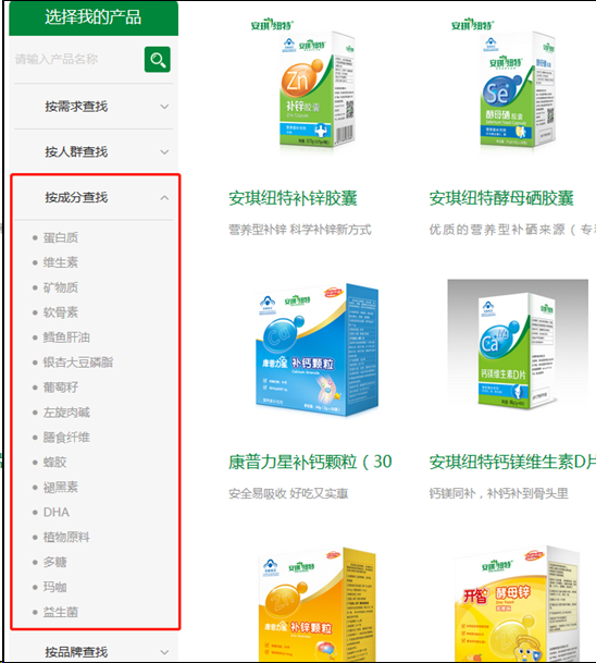2018年安琪酵母营收约66亿元,膳食营养补充产品占营收近10%,而汤臣倍健预计全年营收达40亿元左右,两者不在一个数量级,差距较为明显。不过,从安琪纽特的官网及其网上商城看,安琪纽特在产品布局的宽度及深度已经较为充足,各大类产品几乎都有覆盖,如前文所述,其中包括添加了酵母衍生品的,更多的产品类别是没有添加的。且也按人群、需求、成分等分类,如下图所示。