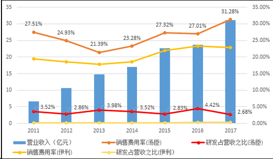 能自2010年以来实现高达36%的复合增长,汤臣倍健的经营策略或在某种程度上反映行业的一些核心竞争逻辑。汤臣倍健近些年一直在做两件事:拓宽产品线、拓宽销售渠道,其中拓宽产品线的主要方式包括加大研发、并购扩容,而拓宽销售渠道的主要方式包括品牌宣传、线下药店、线上销售等。两类方式分别以研发及投资支出、销售费用等形式表现在历年的财报中,如下图所示,汤臣倍健的销售费用率明显超出伊利股份,而伊利股份的销售费用率在整个A股都算比较高的,研发支出方面,汤臣倍健大幅超出伊利股份,甚至超出很多药企。