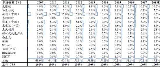 膳食营养补充剂占整个保健品行业90%以上的市场份额,相关数据显示,2018年我国膳食营养补充剂市场规模达到1485.5亿元,同比增长9.2%。行业参与者众多,市场集中度低,竞争同质化情况严重,据欧睿数据,行业CR3仅为26%,市占率超过1%的仅12家,且国内品牌较国外品牌普遍存在研发实力弱、品牌粘性差的问题。