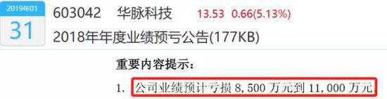 根据2018年业绩预告,华脉科技预计亏损8500万-11000万。根据前三季度累计亏损421.38万元计算,仅2018年第四季度,华脉科技亏损在8,078.62万-10,578.62万之间。