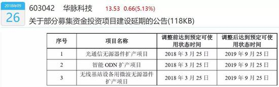 2018年9月26日,华脉科技发布关于部分募集资金投资项目建设延期的公告,将前三大募投项目预定可使用状态时间从2018年3月25日,调整至2019年9月25日,延期一年半。