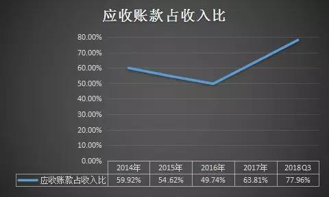 如上表所示,上市之前,华脉科技应收账款占收入比保持下降趋势,从2014年的59.92%下降到2016年的49.74%。然而,上市当年的2017年,应收账款大幅提升,占收入比重迅速提高到63.81%。到2018年三季末,该指标持续上升,已高达77.96%。(注:2018年三季报数据,已相应进行了年化处理)