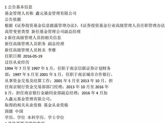 公开资料显示,李雁曾任职于南京信联证券计划财务部,南京城市合作银行,南京银行资金交易部部门经理。2013年10月至2016年3月,担任南京银行资产管理部副总经理、金融同业部副总经理;2016年4月加入鑫元基金管理有限公司。2016年5月19日起担任鑫元基金管理有限公司副总经理。