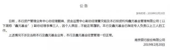 上述情况不涉及当前南京银行及鑫元基金业务,南京银行及鑫元基金经营管理一切正常。