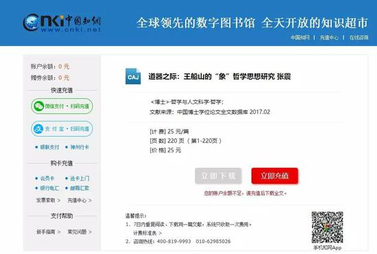 以东南大学博士张震的学位论文《道器之际:王船山的“象”哲学思想研究》 为例,如需下载整本,则需支付25元/篇,目前这篇论文在知网显示的下载次数为286次。
